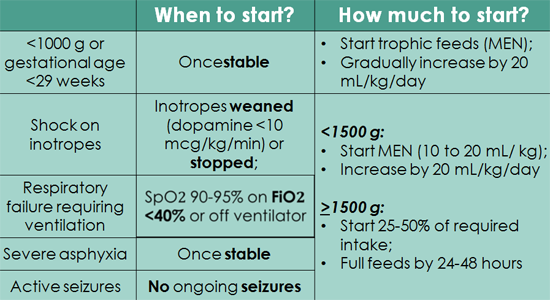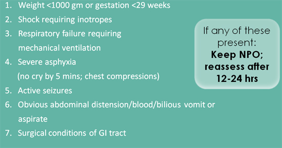 They include weight <1000 g or gestation <29 weeks; shock requiring inotropes; respiratory failure requiring invasive mechanical ventilation; severe asphyxia defined as no cry by 5 min or need for chest compressions; active and ongoing seizures; obvious abdominal distension with or without blood/bile-stained aspirate or vomiting; and finally, surgical conditions of GI tract like intestinal atresia. If any of these conditions are present, we have to keep the baby nil per oral, and reassess after 12-24 hours.