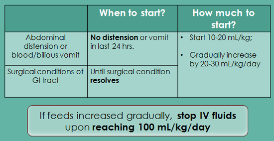Upon reassessment, we should check if the baby is stable, i.e. maintaining normal temp, HR, RR, saturations and capillary refill time with or without support. If stable, we can start oral feeds. For babies <1000 g, we usually start with MEN - minimal enteral nutrition or trophic feeds; This means giving expressed breast milk at 10 to 20 ml/kg/day for 1-2 days and then gradually increasing by 20 ml/kg/day. In other conditions such as respiratory failure, shock, asphyxia, or seizures, we can be little more aggressive we can start at 25 to 50% of required daily intake; if the baby accepts this well, gradually increase to full feeds in the next 24-48 hours. If the baby is <1500 g, start MEN and then gradually increase feeds by 20 ml/kg/d. In babies with abdominal distension or surgical conditions of gastrointestinal tract, we can start feeds if there is no abdominal distension or vomiting in the last 24 hours and the abdomen is soft. In these babies, we usually start feeds at 10-20 ml/kg/d and increase gradually by 20 to 30 ml/kg/day. In all the babies in whom feeds are started slowly, we have to assess if the baby is tolerating feeds by careful inspection of the abdomen before each feed. We shall learn about monitoring of feed intolerance in a separate webinar.
