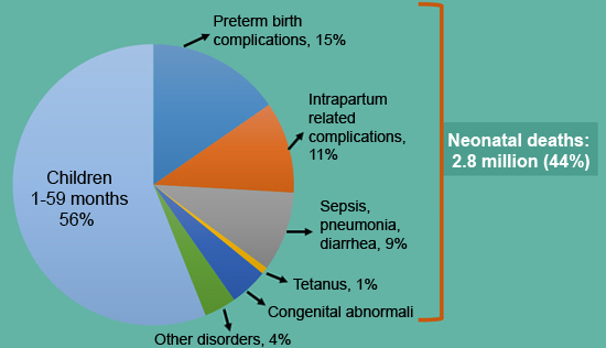 Of 6.3 million U-5 deaths, 2.8 million are neonates- that is nearly 44% of U-5 deaths. This means so many U-5 death happen within just a month of birth. The three most important causes i.e. preterm birth complication, intrapartum related events means asphyxia and sepsis together account for two thirds of neonatal deaths.