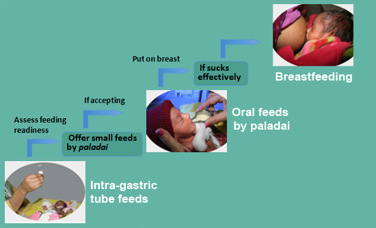 All LBW infants should ideally be on direct breastfeeding by the time of discharge from the hospital, irrespective of the initial feeding method. They must be assessed periodically to check if they are ready to accept BF. For babies on Intra-gastric tube feeds, the feeding readiness should be assessed daily. If ready, they must be offered small feeds by spoon or paladai. If they accept well, the amount by spoon can be slowly increased to reach full paladai feeds. Babies on full paladai feeds should be put to breast daily. They should be assessed for effective sucking at the breast. If they can suckle effectively for adequate time, direct breastfeeding should be initiated.