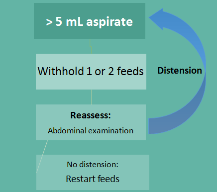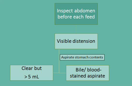 All LBW babies should be assessed for feed intolerance by careful inspection of the abdomen before EACH feed. If there is obvious abdominaldistension,the stomach contents should be aspirated to check the nature and volume of aspirate. If the aspirate is clear but is more than 5 mL, the feeds should be withheld for 1-2 feeds, after which we should reassess by abdominal examination.