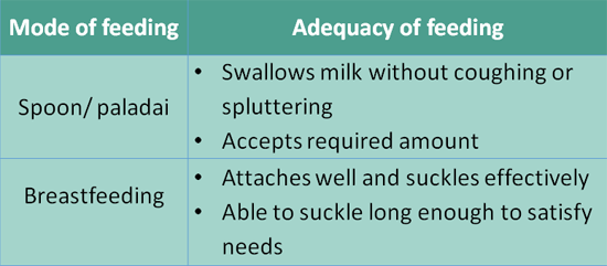 Babies on any mode of feeding – including intra-gastric tube feeding – should be assessed for adequacy of feeding on a regular basis. If the baby is on spoon/paladai feeds, adequacy is indicated by the following criteria: Baby swallowing milk WITHOUT coughing or spluttering, and Baby accepting required amount of milk. Babies on breastfeeding are said to be feeding adequately if: They can attach well and suckle effectively; and they can suckle long enough to satisfy needs. For all modes of feeding, other indicators of feeding adequacy include. Adequate weight gain – 15 to 18 g/kg/d after 7-10 days of birth; and Passing urine at least 6 times in 24 hrs