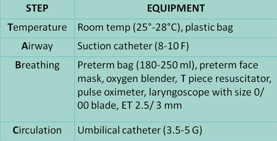 In addition to regular resuscitation equipments preterms need following specific equipments. For thermal care, room temp should be kept at 25-28 C and in addition a plastic wrap be kept ready for very preterm babies. Suction catheters of size 8-10 F Gauge is required to suction when indicated, To support breathing, Preterm self inflating bag (180-250 ml), preterm face mask, oxygen blender, T piece resuscitator, pulseoximeter is necessary. A laryngoscope with size 0 and 00 blade with ET size of 2.5 should be immediately available. An equipment checklist in the delivery room helps to ensure all equipments are present and in working condition.